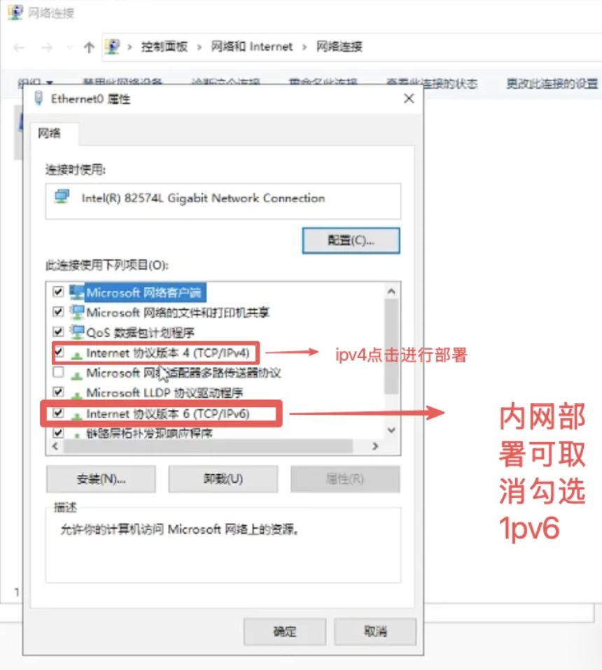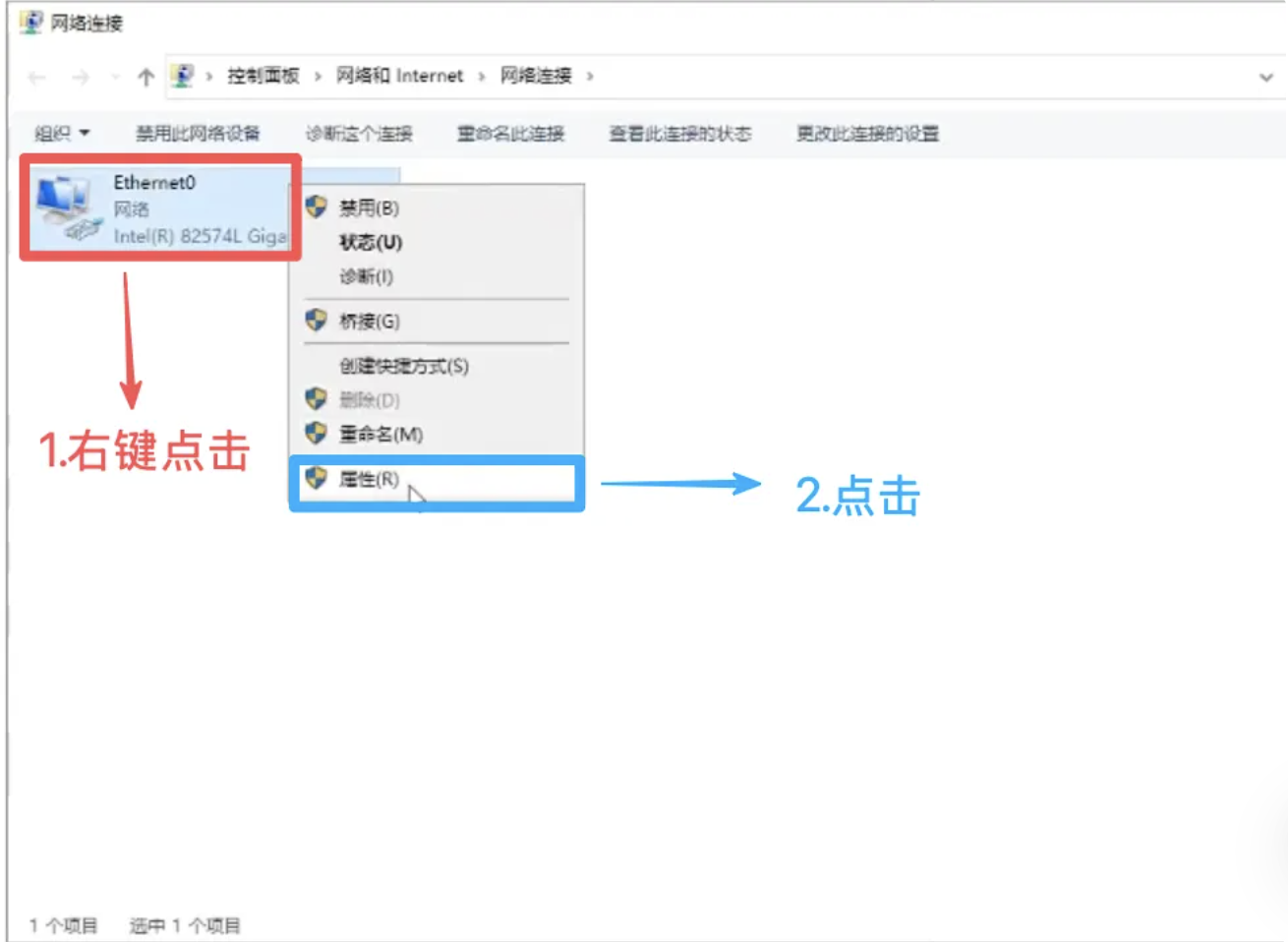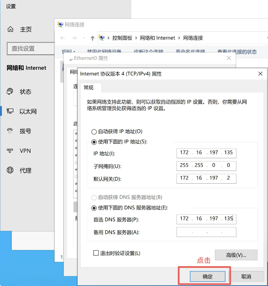 点击Ethemet0->点击属性->点击协议版本4->点击使用下面ip地址