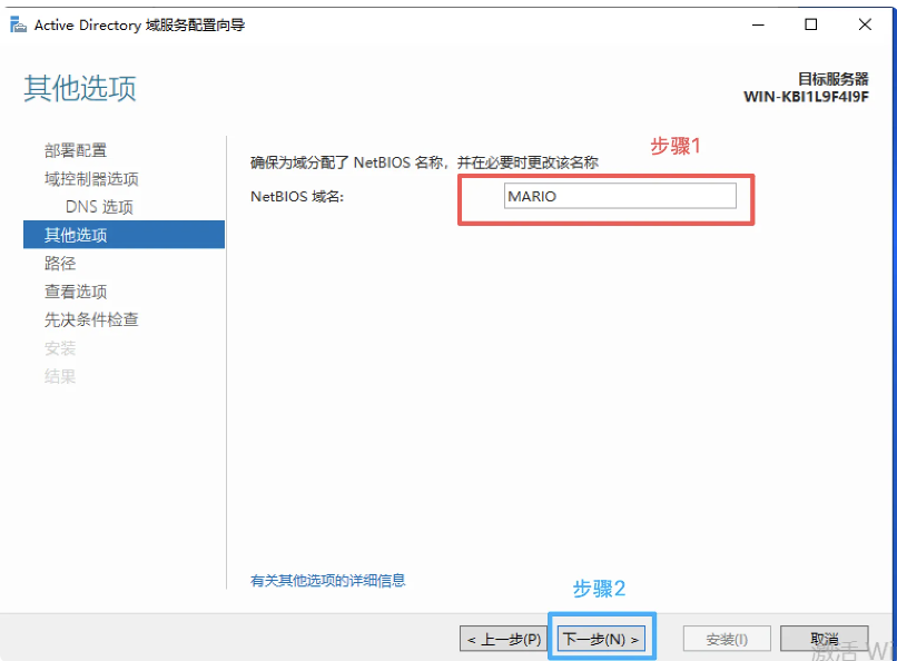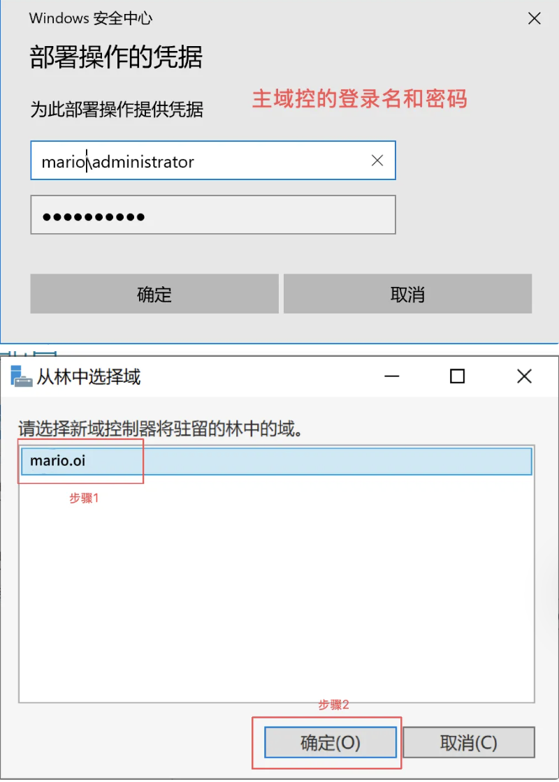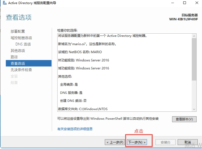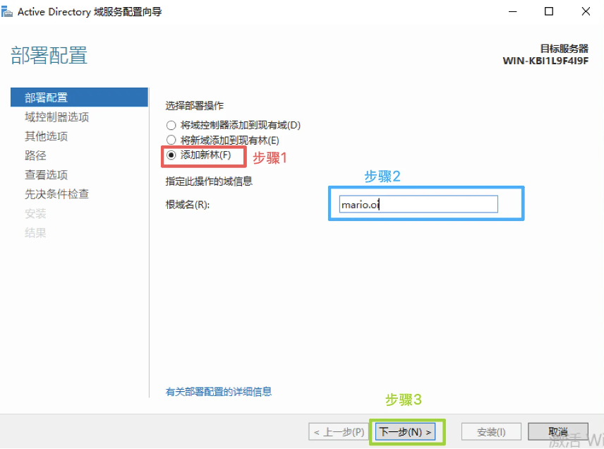 部署配置->因为是第一台主域控服务器->添加新林->根域名(自取):mario.oi→下一步