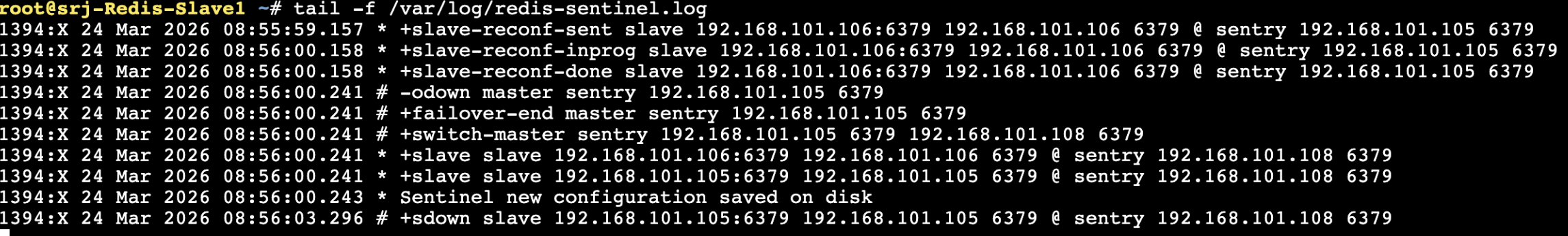 原主节点重启后,会自动变成新主的从节点,不需要手动改配置,就像原来的主卧修好回来,只能当次卧,服从新主卧,目的是验证集群自愈能力,节点恢复后自动加入集群,如关掉的主节点:192.168.101.105 这台机器,我们重启