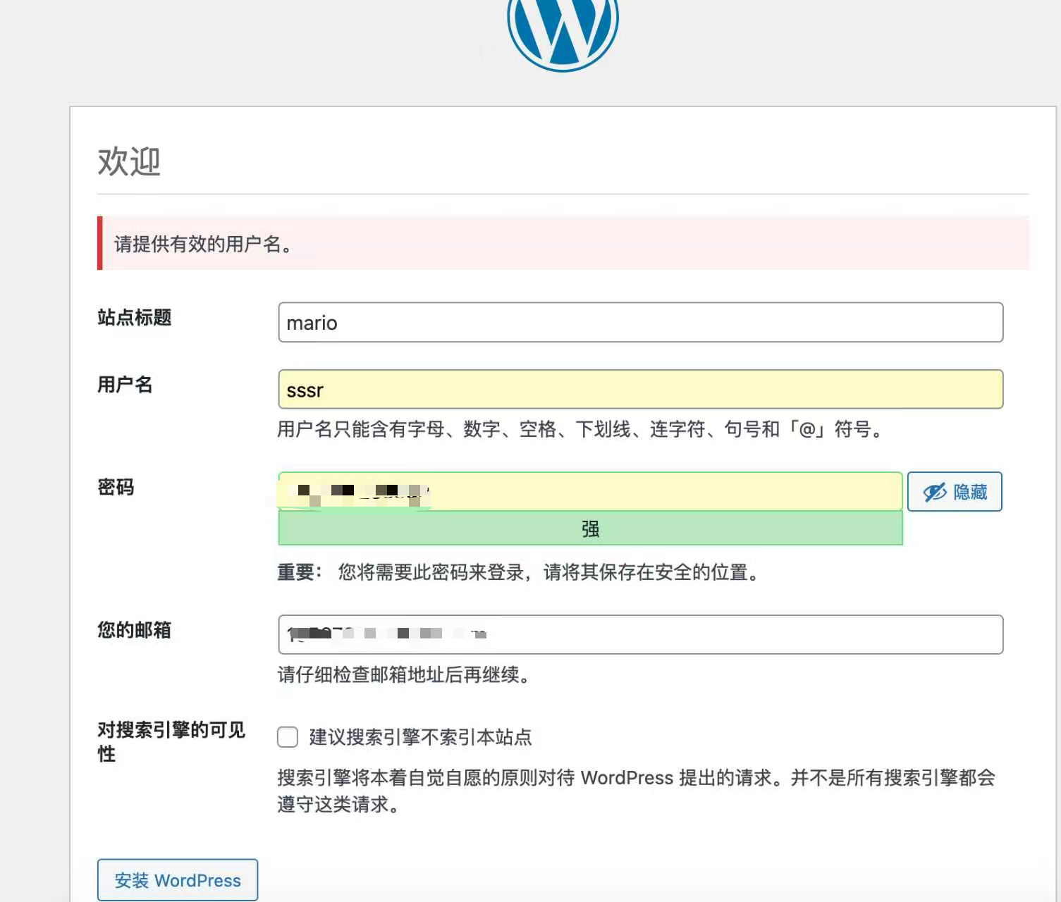 步骤11:输入DNS上你输入的域名,会出现wordpress注册