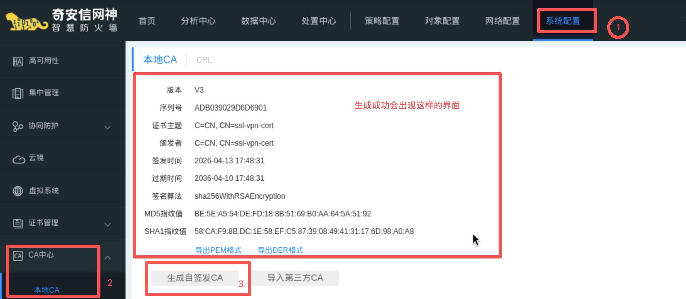 操作路径 1 :系统配置 -> CA中心 -> 本地CA -> 生成自签CA