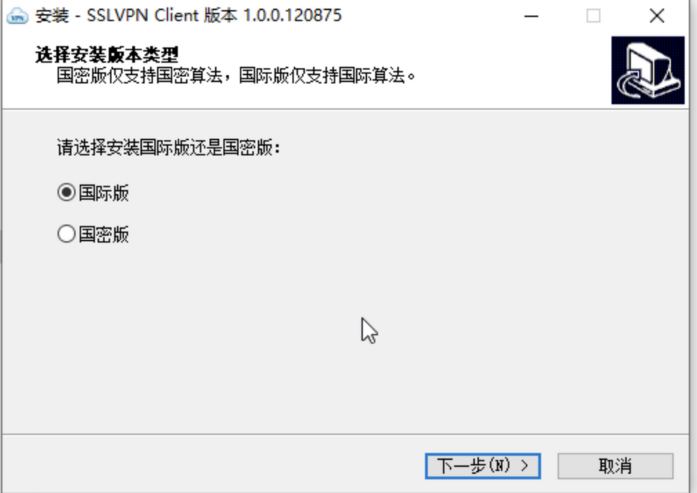 安装界面选择 国际版,与防火墙算法类型一致,否则无法连接