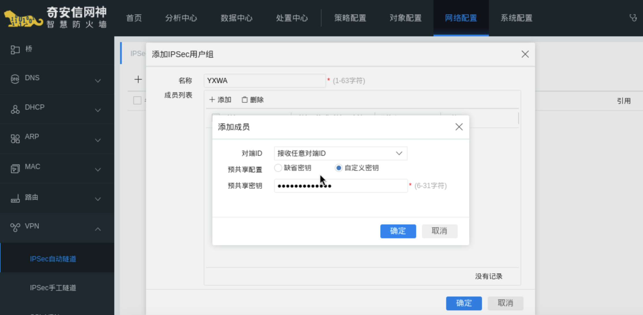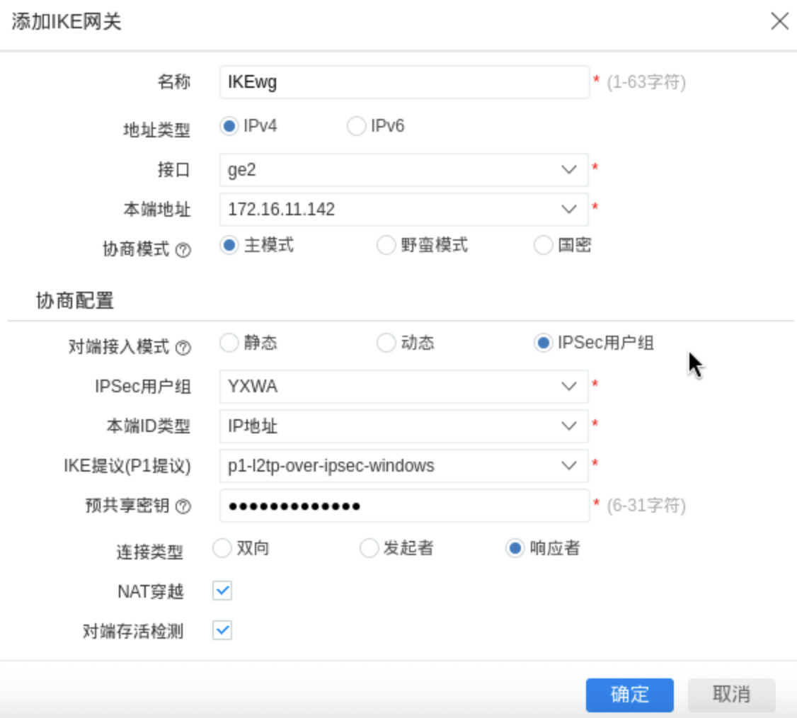 配置图:对端ID选择“接收任意对端ID”,自定义预共享配置并配置预共享秘钥