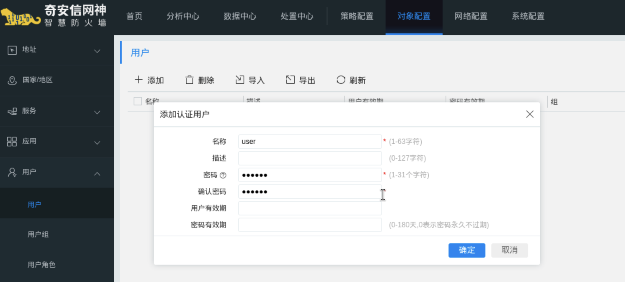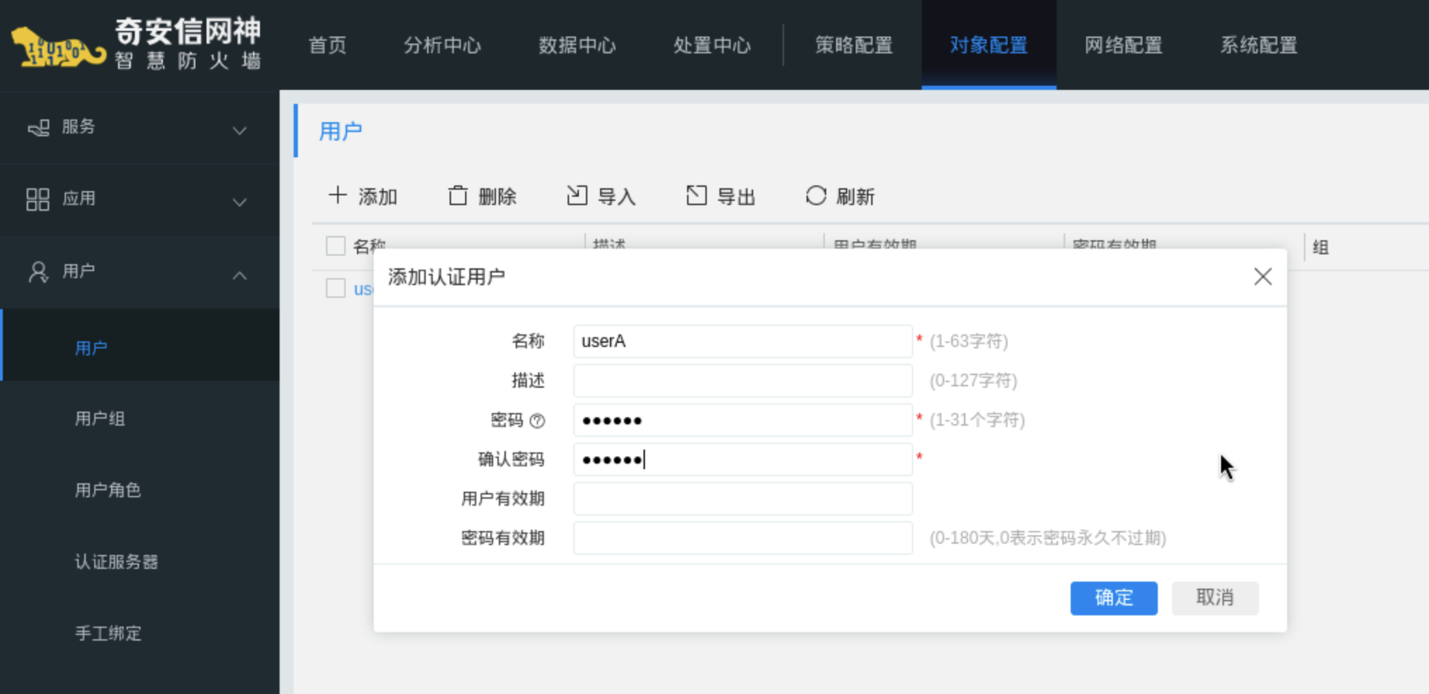 操作路径:对象配置 -> 用户 -> 用户 -> 添加,配置认证用户