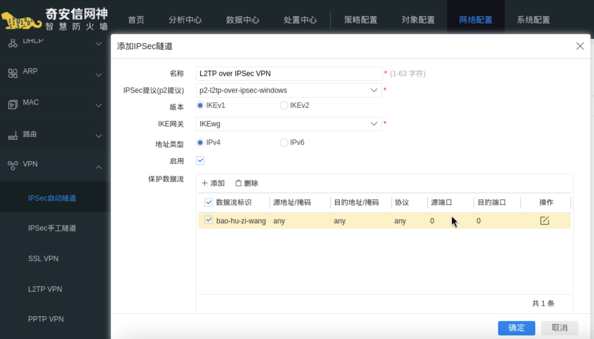 配置图:保护数据流,点击添加,配置any到any的保护数据流
