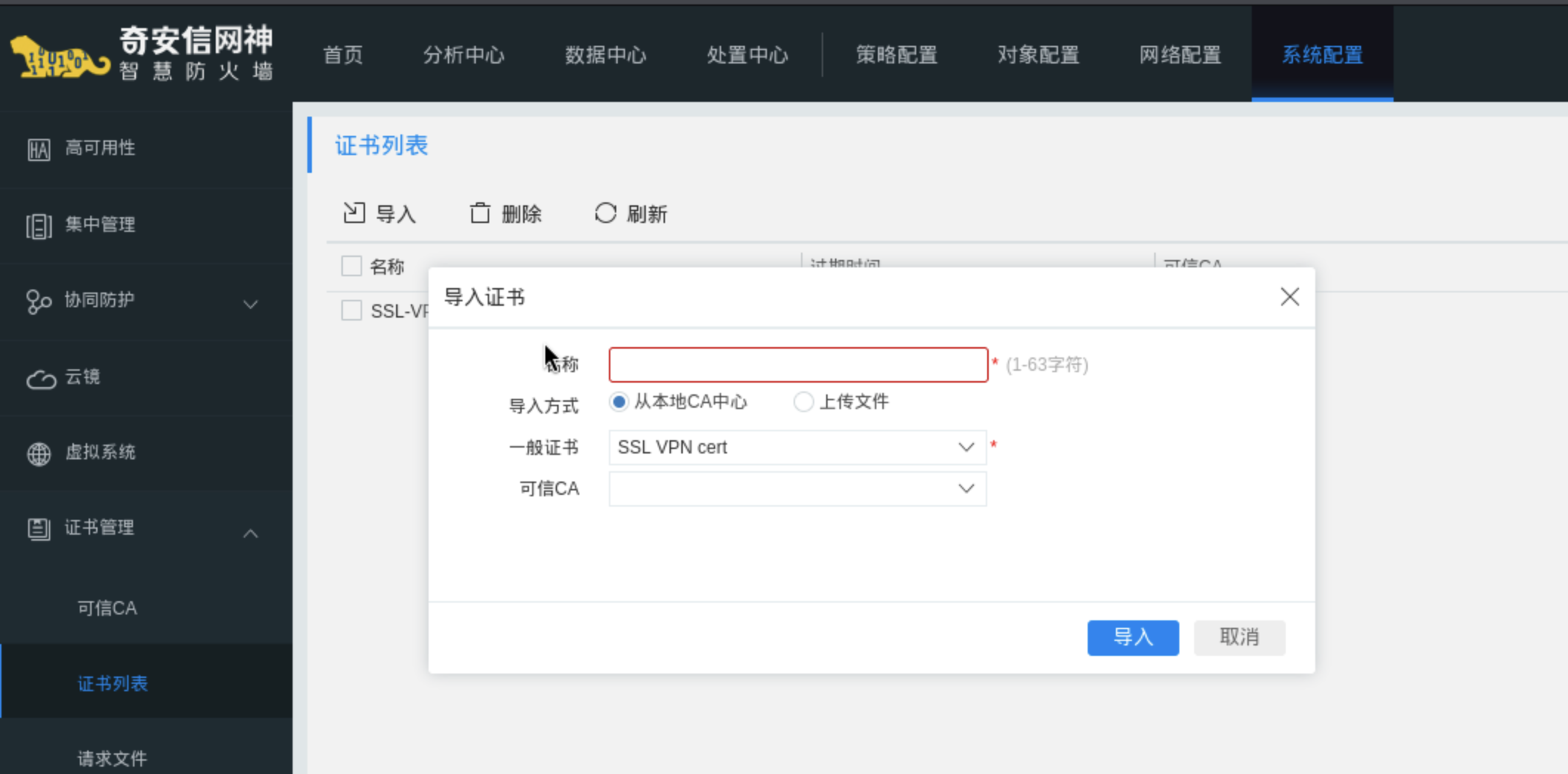 操作路径 3 :系统配置 -> 证书管理 -> 导入