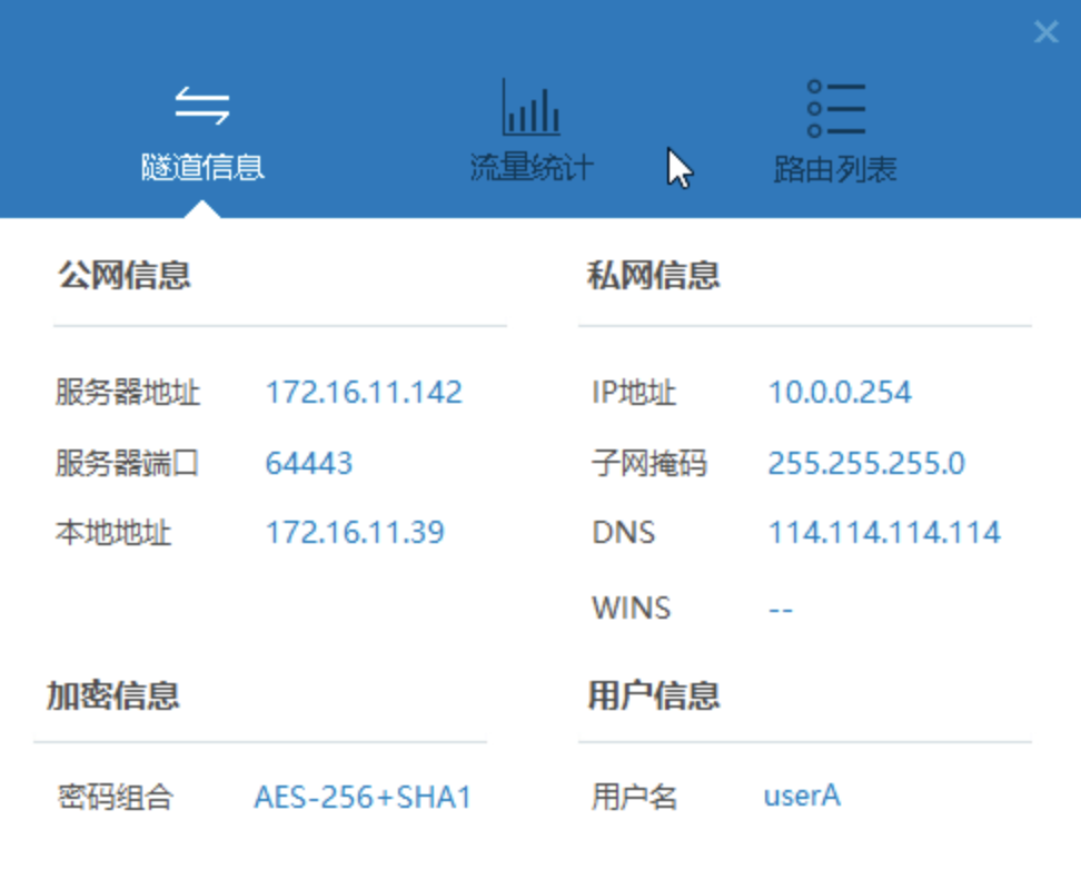VPN 认证用户:userA ,密码:654321(本地认证,统一登录账号)