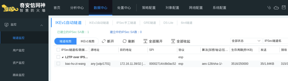 验证2: 登录防火墙,选择数据中心 -> 监控 -> 隧道监控,可以查看建立的IPSec VPN的信息