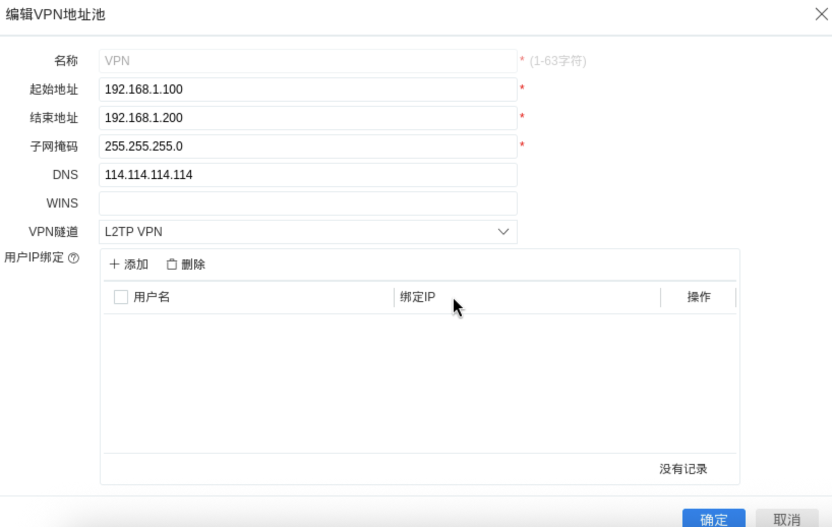 操作路径:网络配置 -> VPN -> VPN 地址池 -> 添加