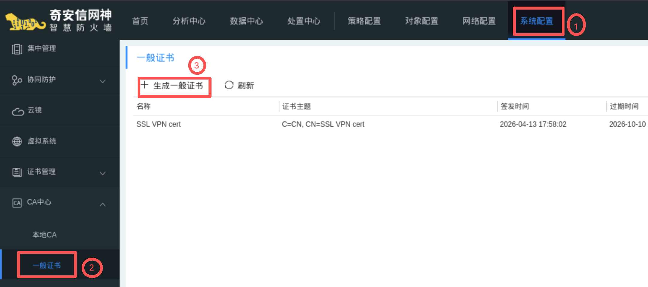 操作路径 2 :系统配置 -> CA中心 -> 一般证书 -> 生成一般证书