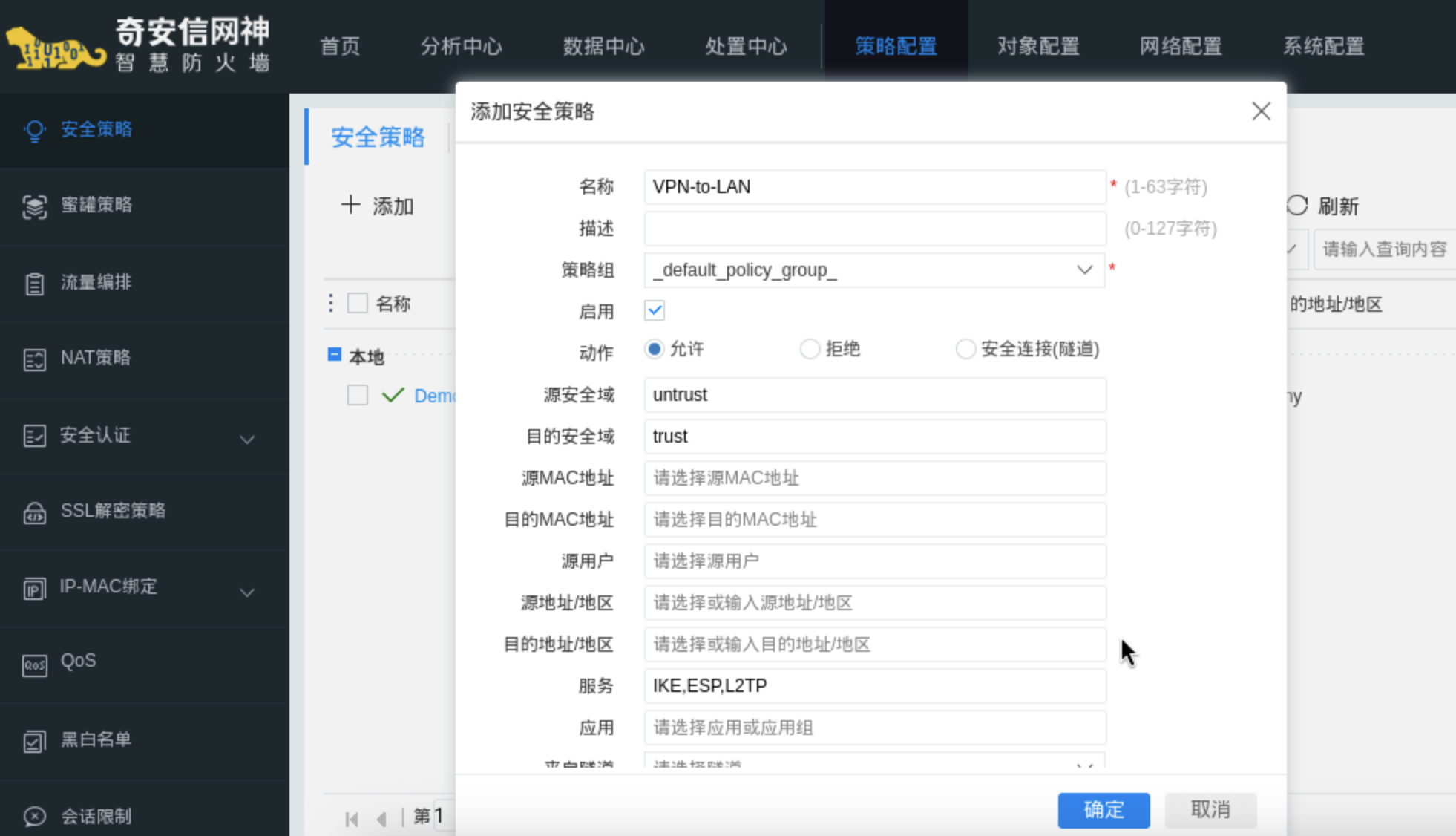 操作路径:策略配置 -> 安全策略 -> 添加