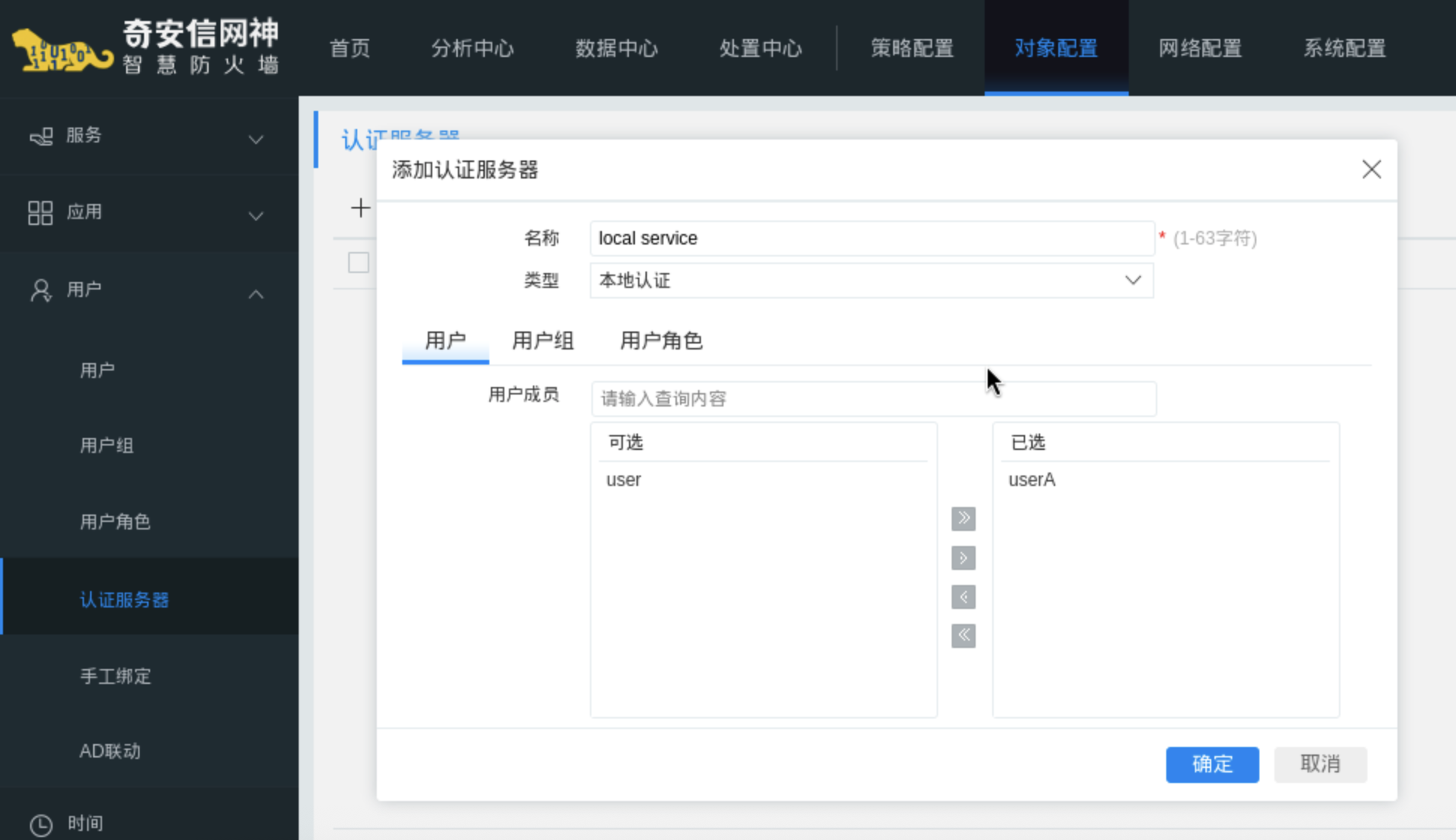 操作路径:对象配置 -> 用户 -> 认证服务器 -> 添加