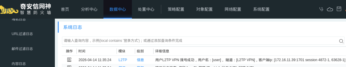 验证1: 登录防火墙,选择数据中心 -> 系统日志 可以看到 IPSec VPN和L2TP VPN成功连接的日志