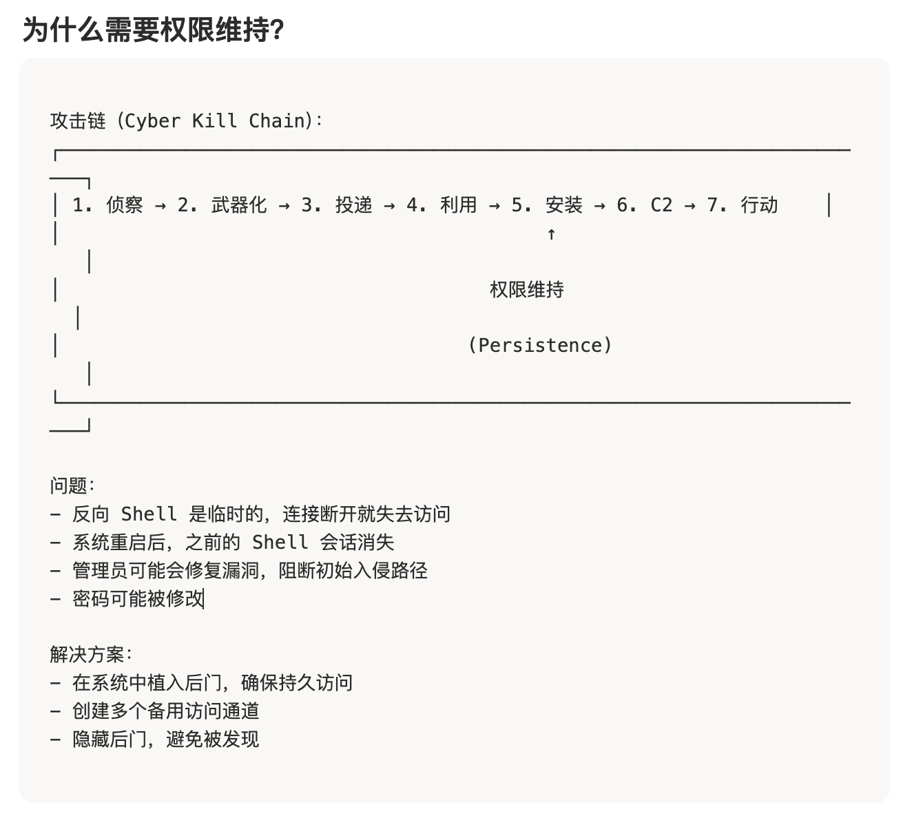 在动手实验之前,你需要先理解权限维持的核心概念和技术分类。学完本部分后,你应该能够: