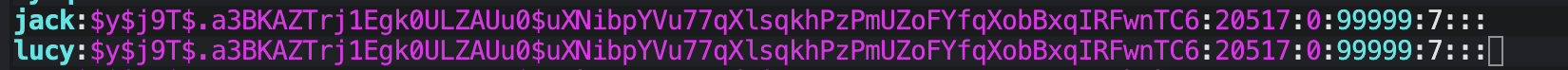1.修改jack密码,把新密码给lucy用(此前需要进入/etc/shadow把jack的旧哈希值保存,后续需要用)