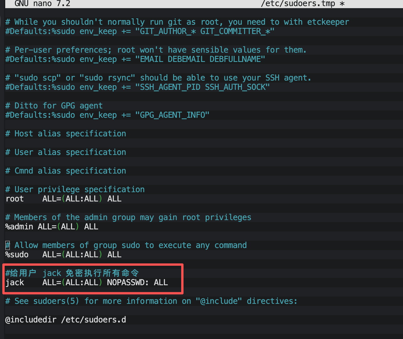 jack ALL=(ALL) NOPASSWD: /usr/bin/vim, /usr/bin/cat解释:jack 用户可以在所有主机(ALL)上,以所有用户身份(ALL),免密执行