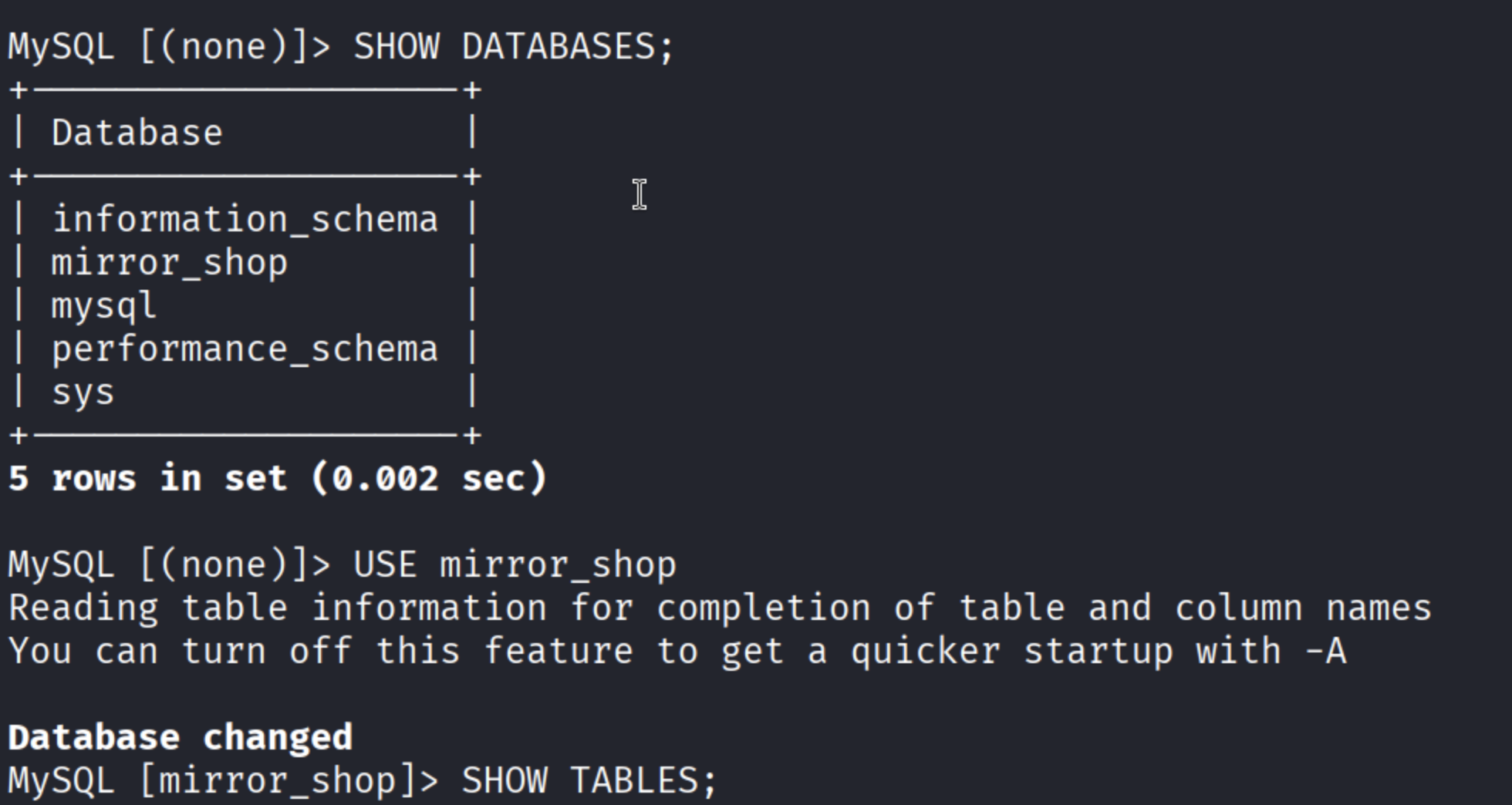 mysql -h 192.168.101.117 -u root -pKp7mXz2wRn9sLqDf --skip-ssl结果图