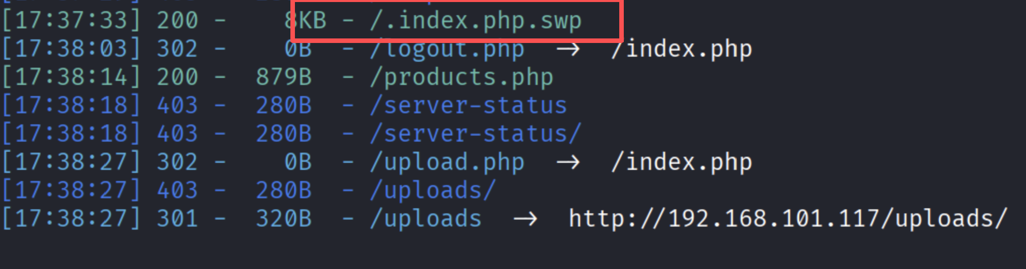 dirsearch -u http://192.168.101.117 -e php,txt,bak,swp,old结果图