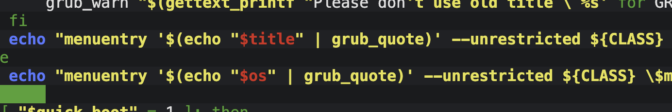 echo "menuentry '$(echo "$os" | grub_quote)' --unrestricted ${CLASS}..."结果图