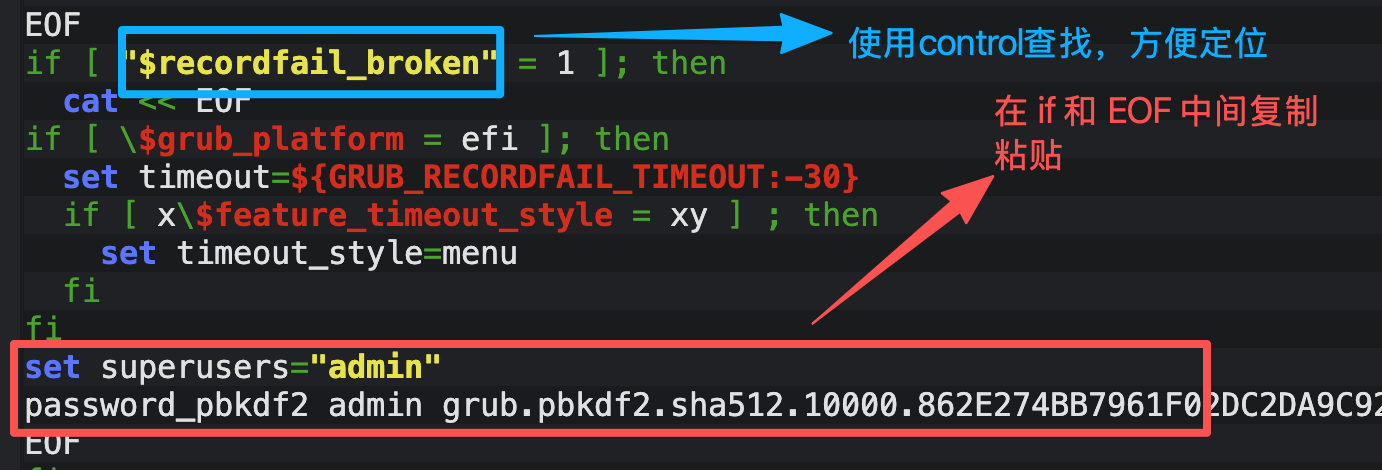 password_pbkdf2 admin 复制的grub.pbkdf2.sha512开头的哈希字符串结果图