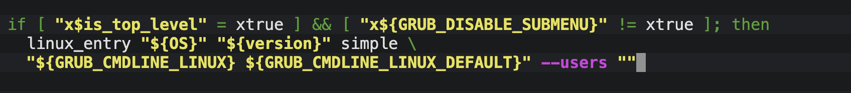 echo "menuentry '$(echo "$title" | grub_quote)' --unrestricted ${CLASS} ..."