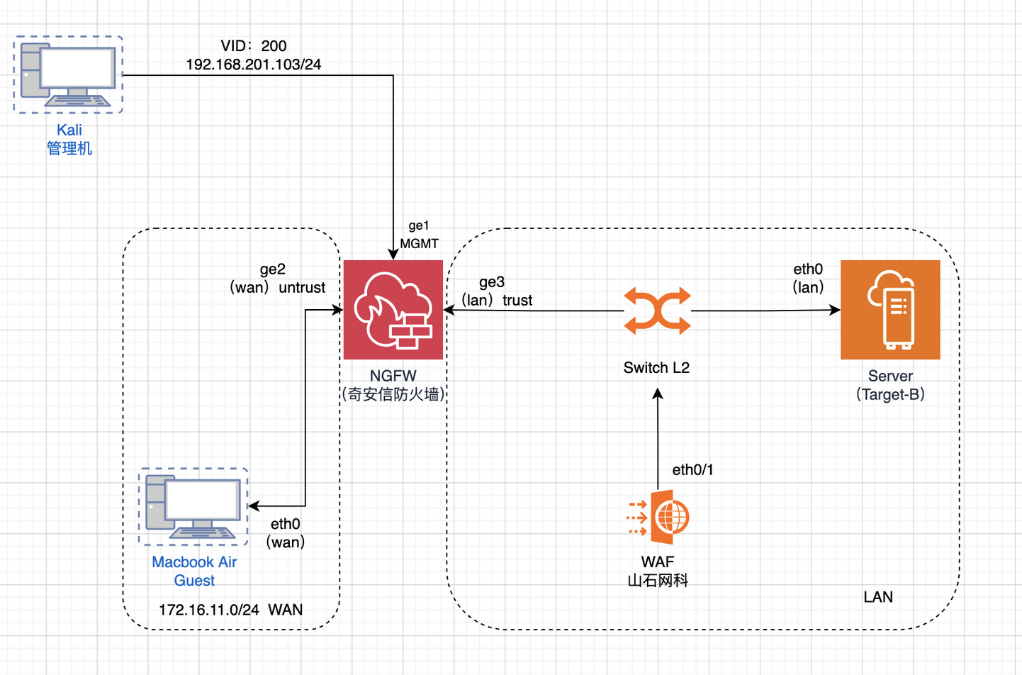 关键说明:ge1 仅用于 Kali 管理机远程管理,不承载业务流量;ge2 对接 WAN 网段,ge3 作为 LAN 内网网关,为 WAF 与服务器提供网络接入