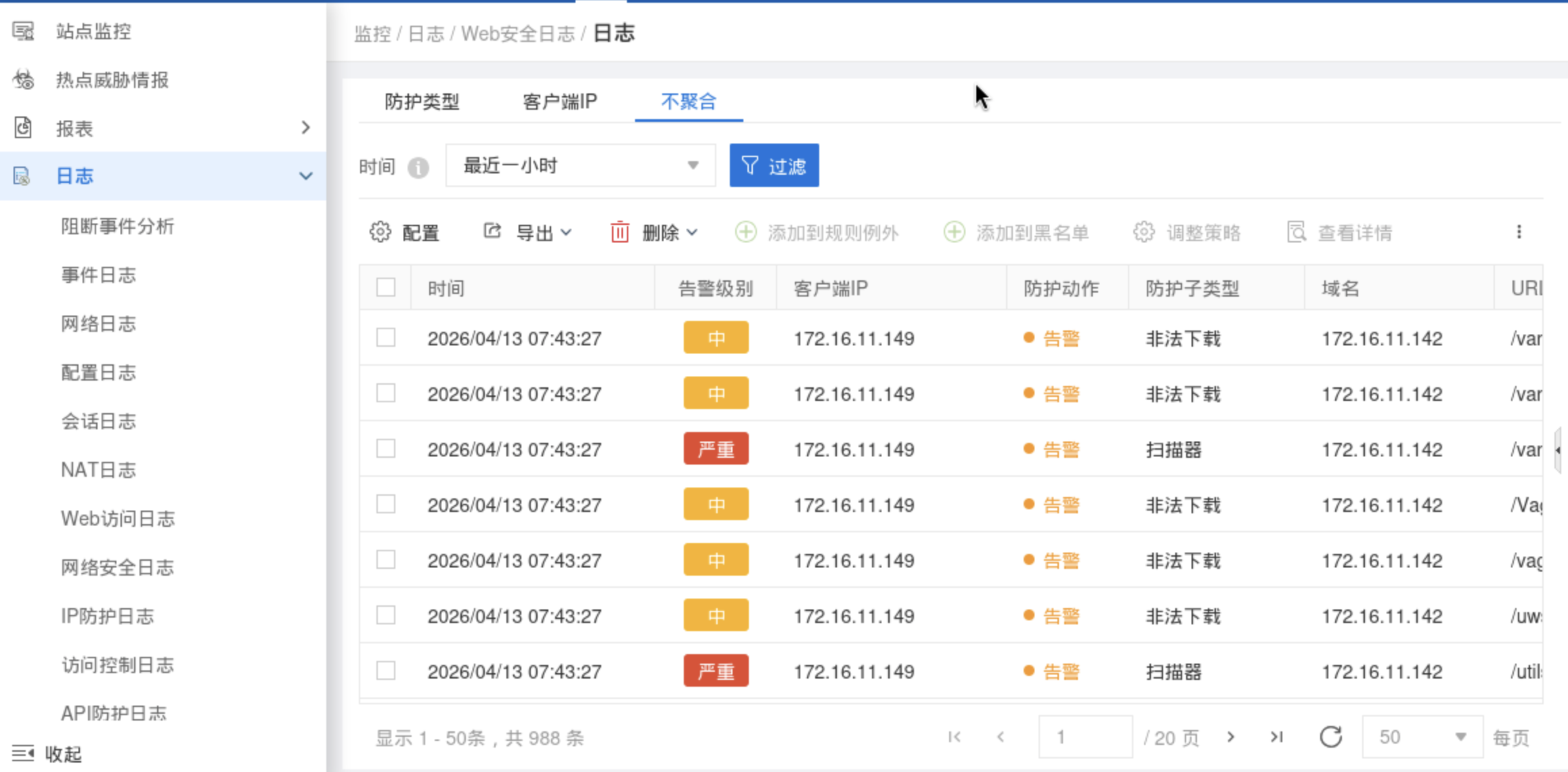 扫描、注入等攻击会被 WAF 识别、告警、拦截