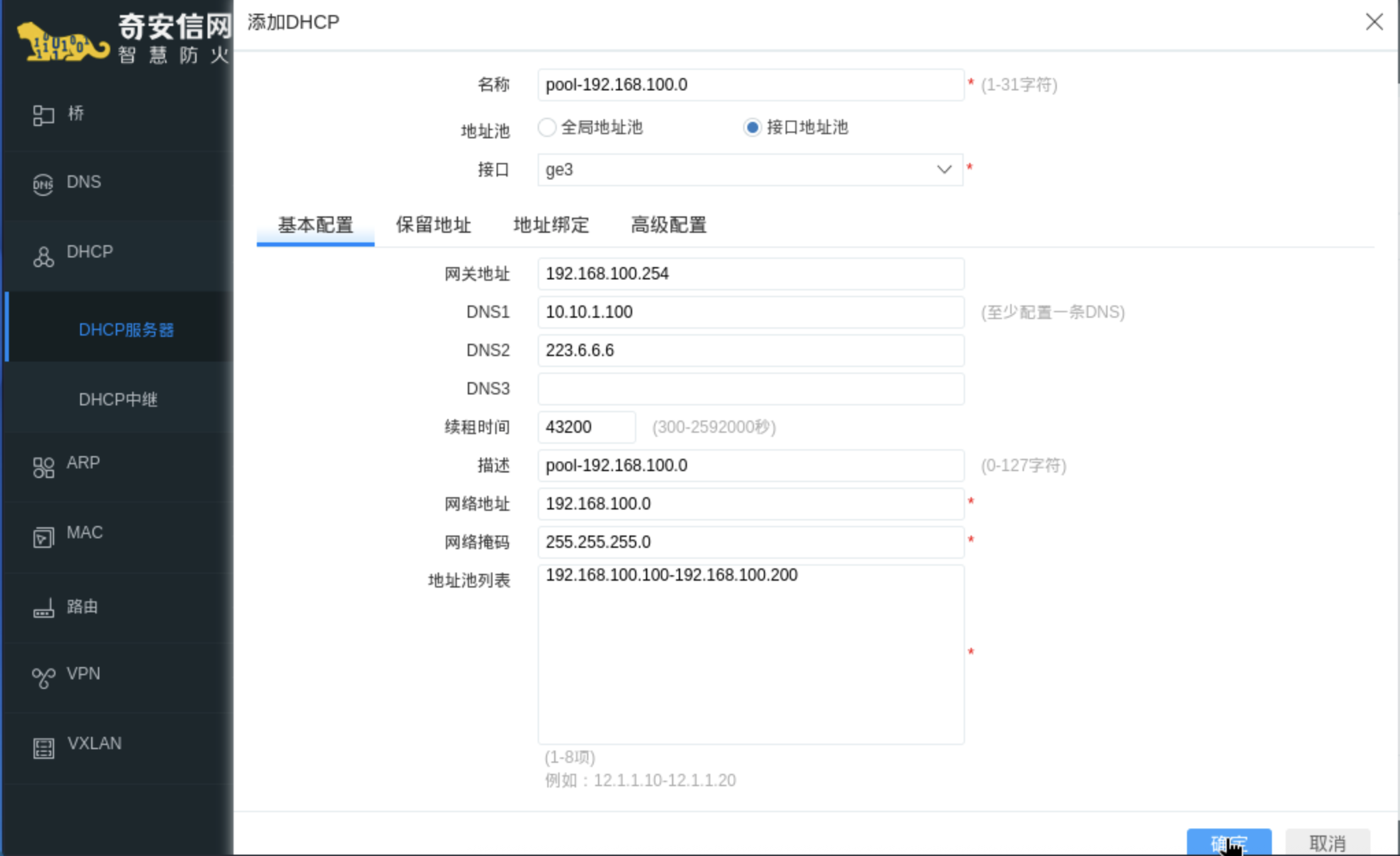 进入【网络配置】->【DHCP】->【DHCP 服务器】-> 【+ 添加】,为 LAN 网段配置地址池