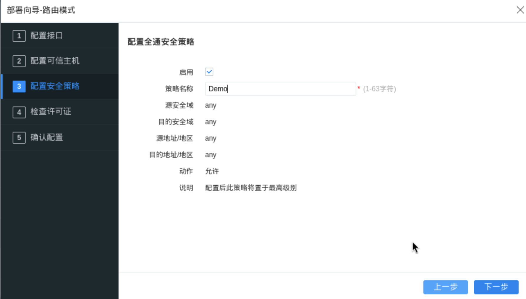 配置安全策略:填写策略名称 -> 点击下一步
