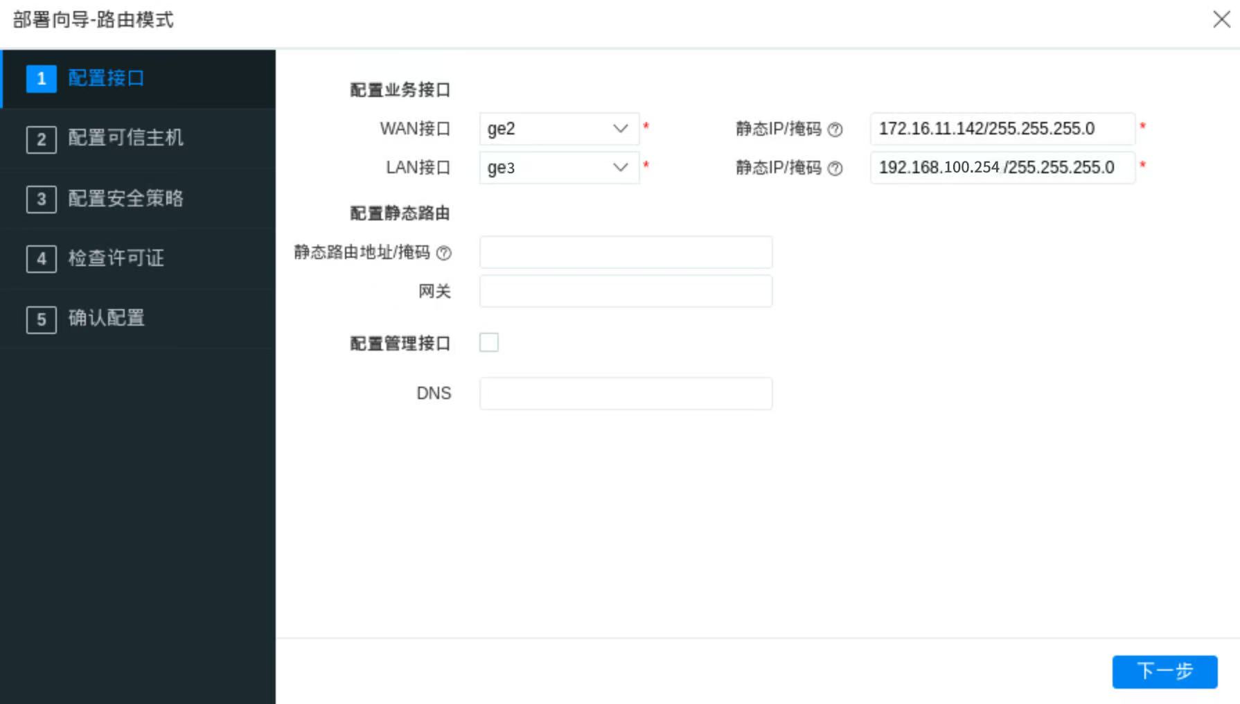 配置接口:配置WAN口(外网出口) -> LAN口(内网网段) -> 点击下一步