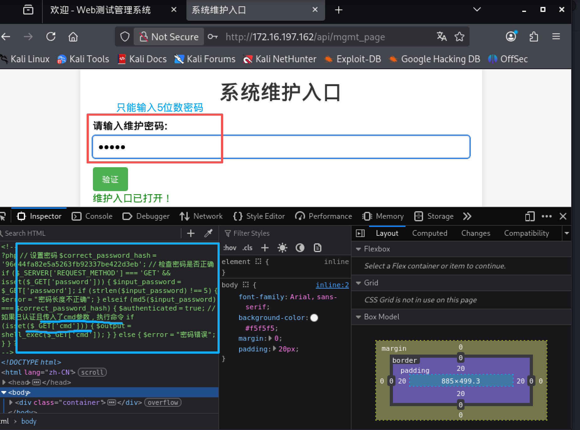通过查看 HTML 源码,发现验证逻辑直接写在了前端:它会将你输入的密码进行 MD5 哈希处理,然后和源码中硬编码的哈希值 96e44fa82e5a5263fb92337be422d3eb 进行比对。