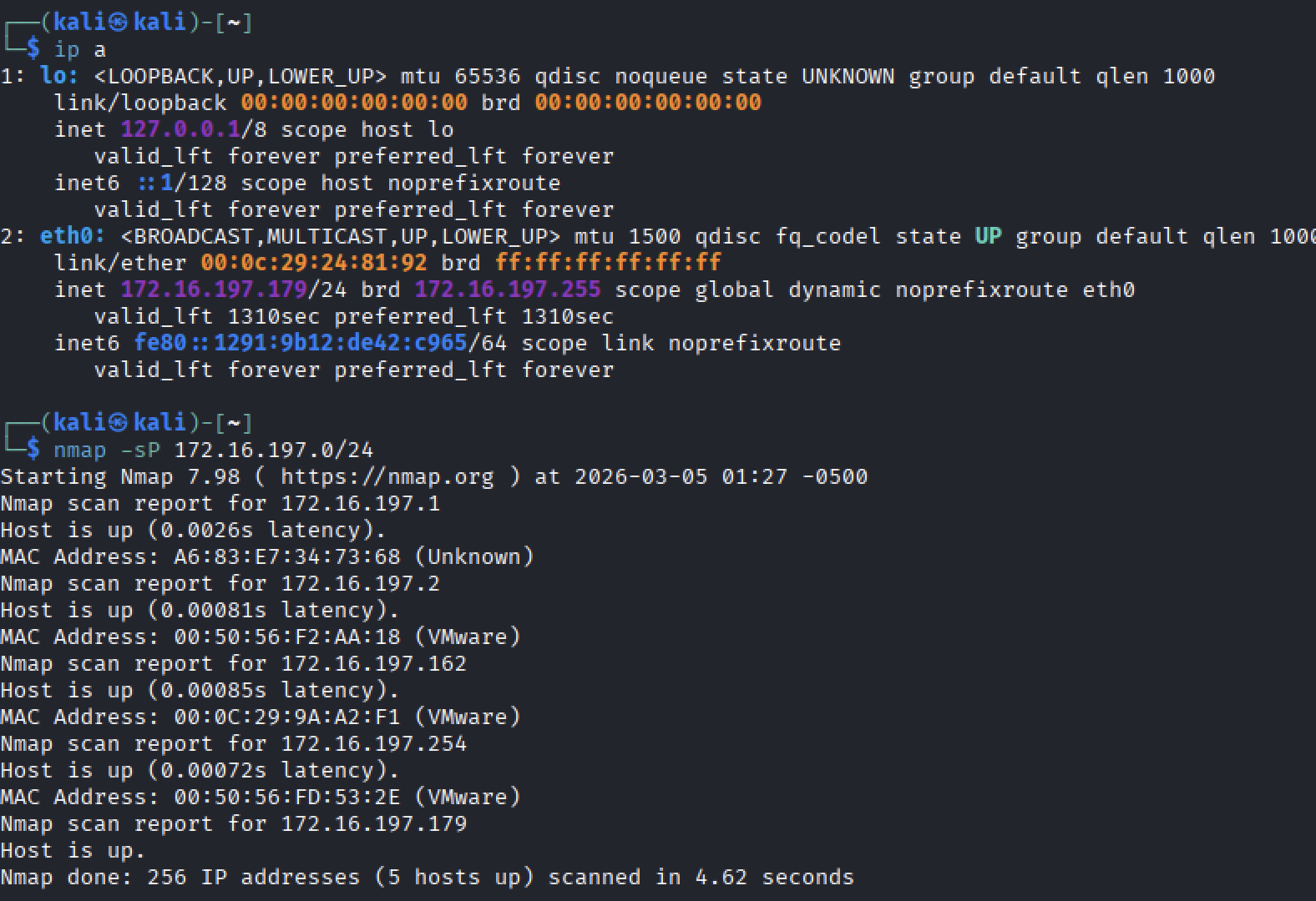 172.16.197.0/24内,因此可以使用namp指令进行ping找出在172.16.197.0~172.16.197.255之间存在的主机