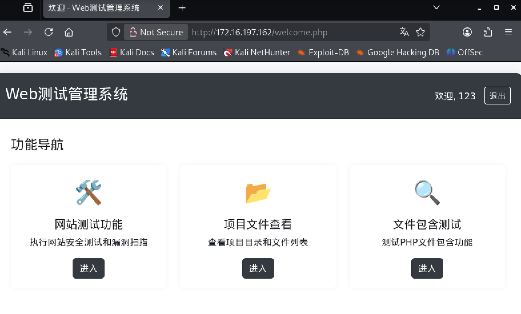 发现有三个功能,但只有网站测试功能能进入,其他两个功能并不能使用并,所以先试试看看网站Cookie有没有可以伪装成管理员的可能