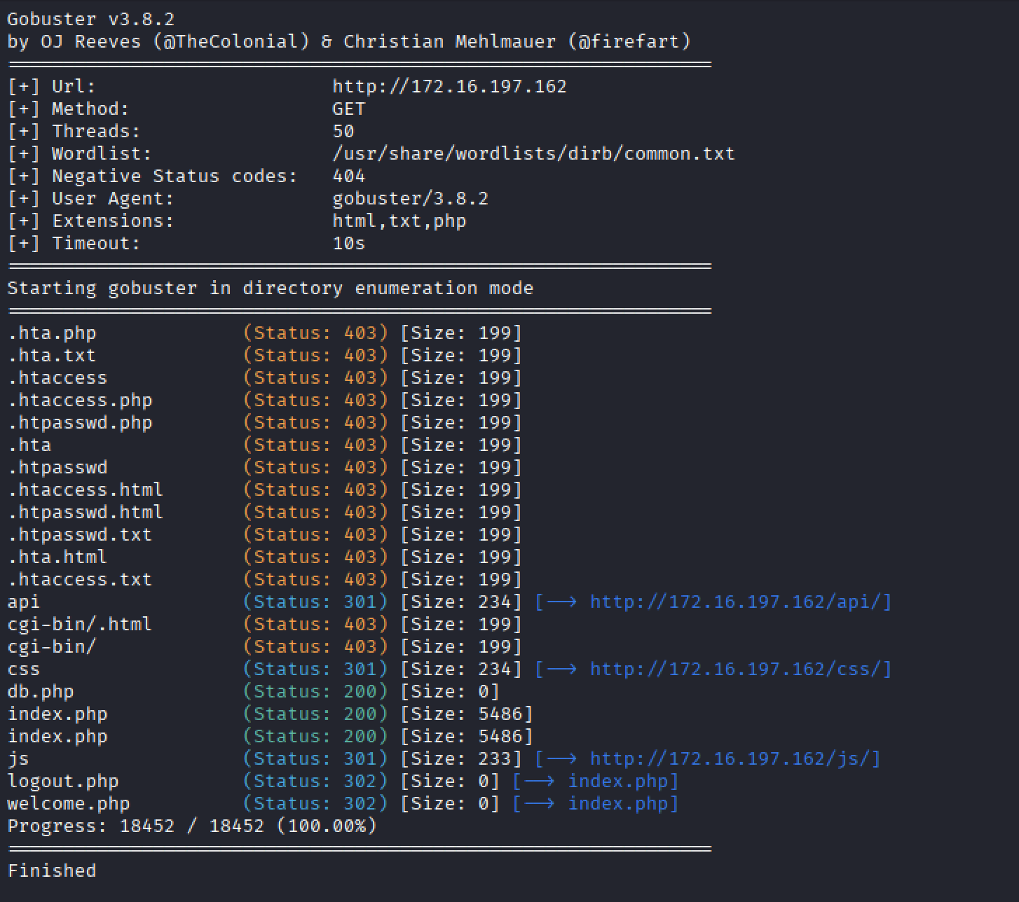 gobuster dir -u http://172.16.197.162 -w /usr/share/wordlists/dirb/common.txt -x php,html,txt -t 50