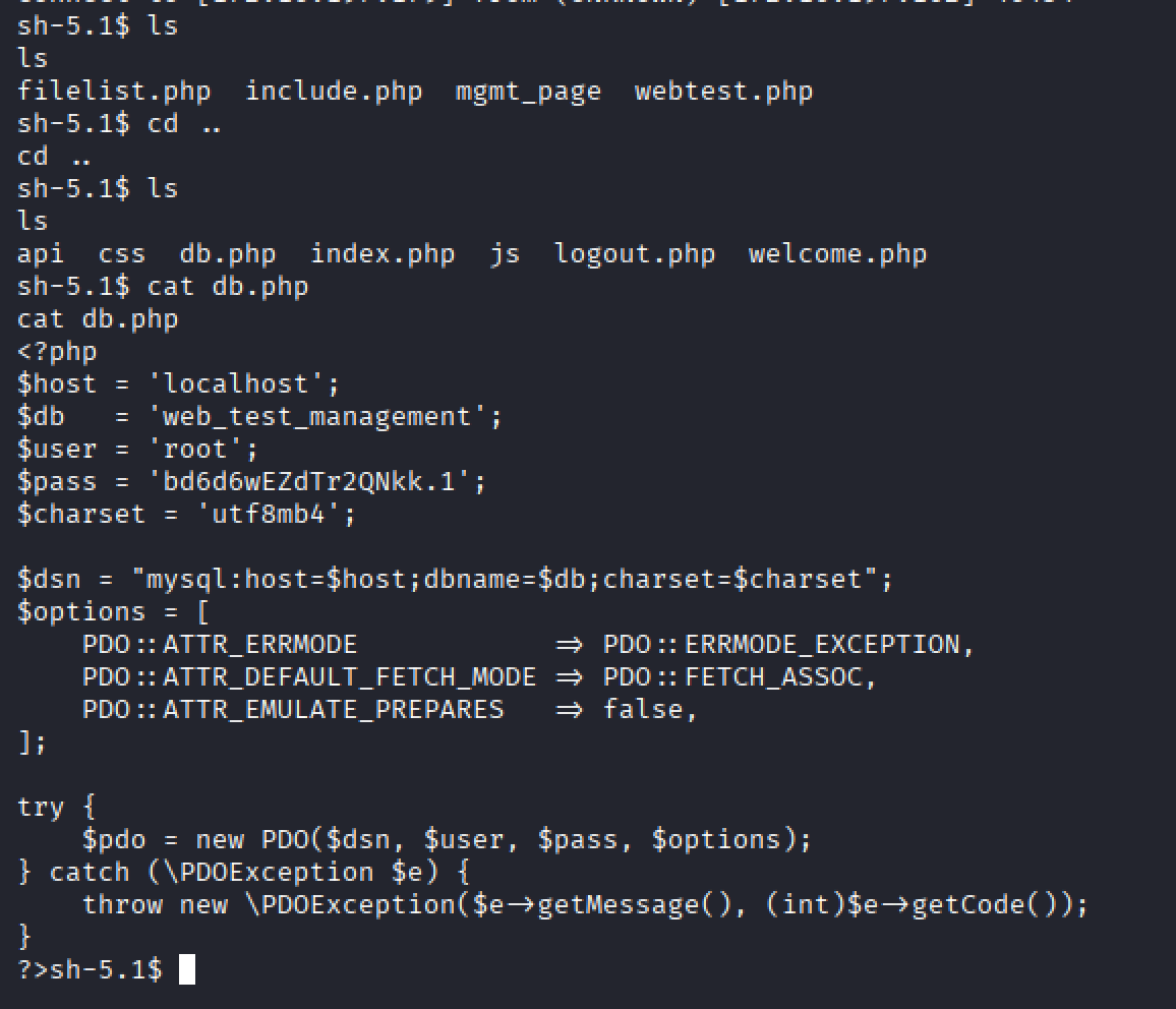 (2)基于当前服务环境为 Apache,可判断控制点位于 Web 根目录 /var/www/html 下的某一子目录中。经目录回溯,在其上级目录中发现 db.php 配置文件。查看该文件后,成功获取其中存储的数据库连接账号与密码