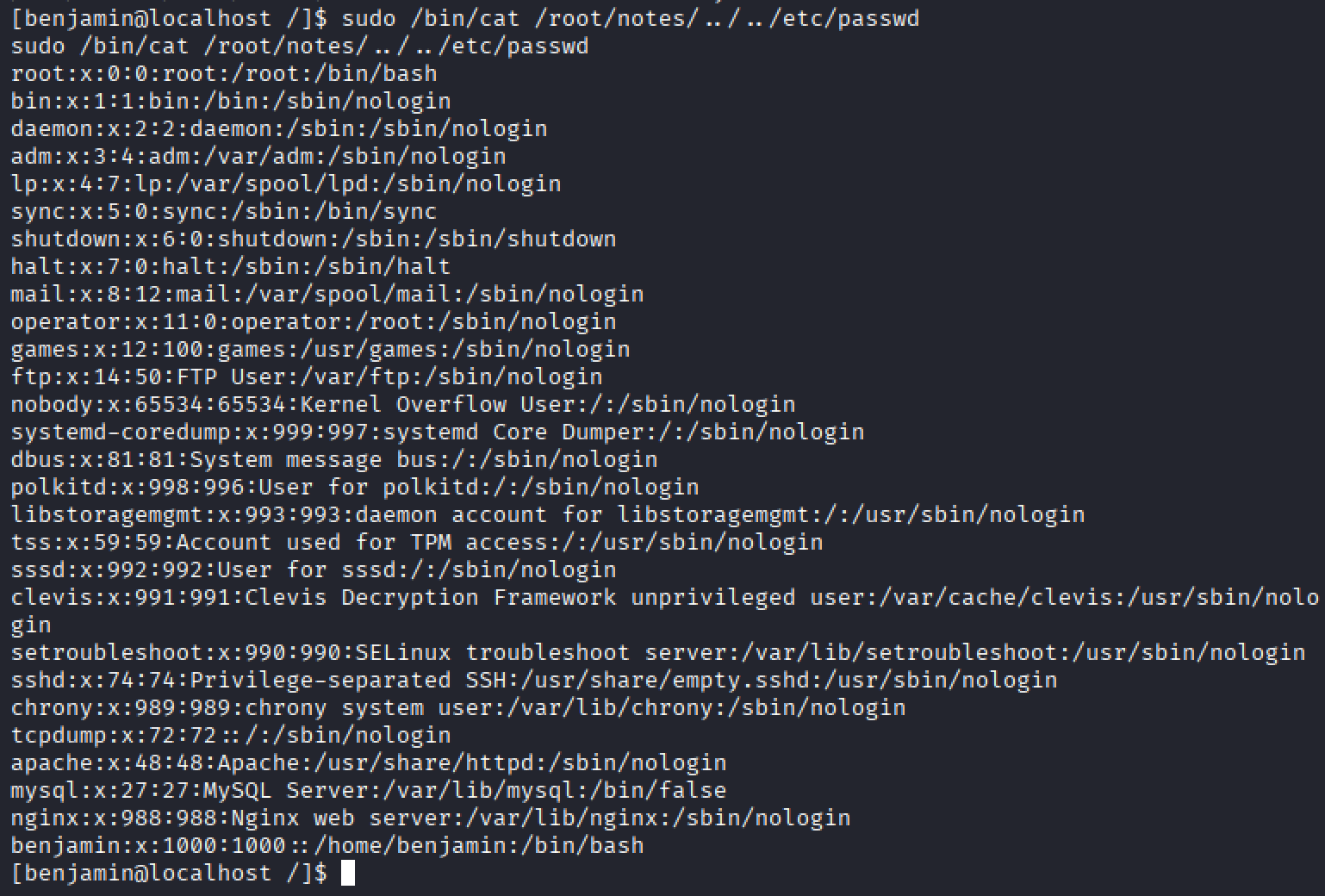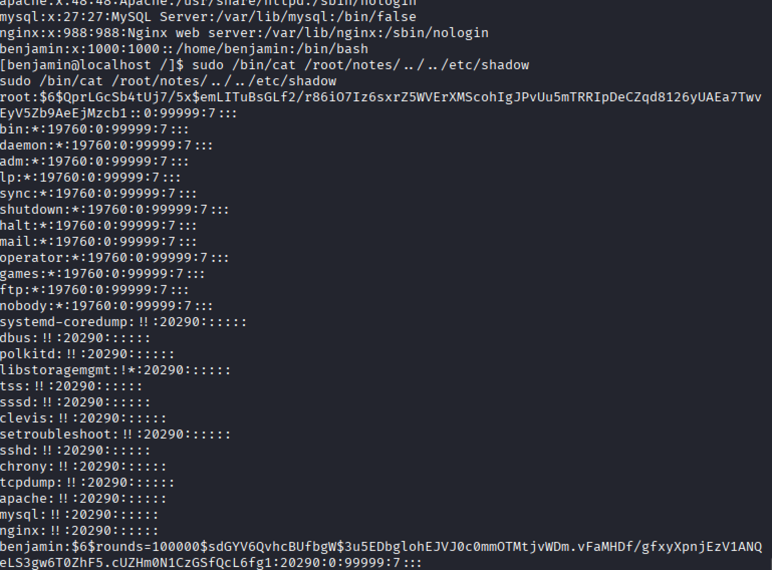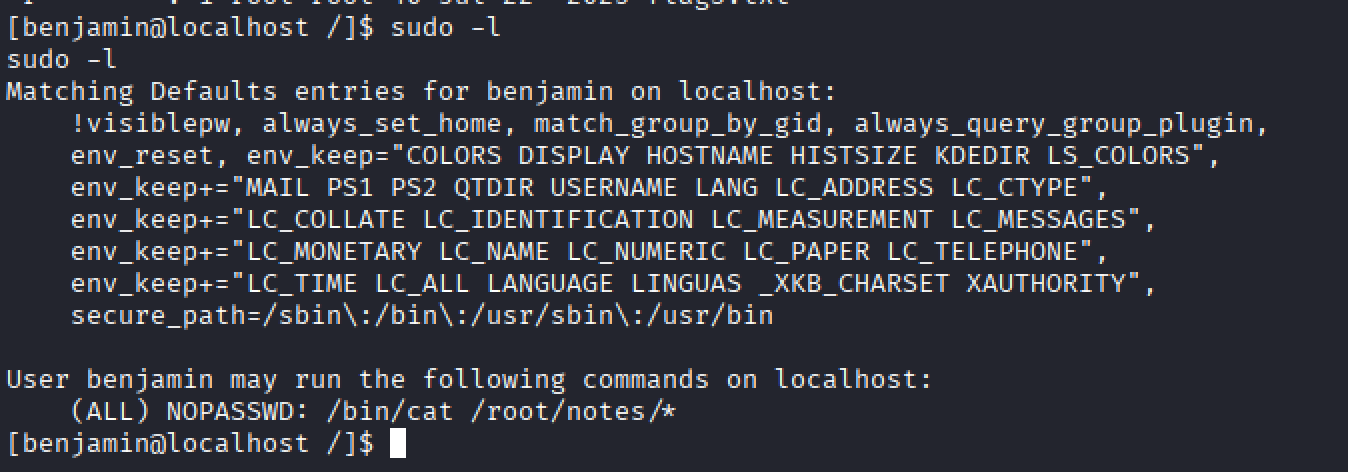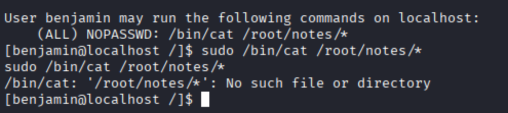 sudo配置缺陷: benjamin用户可无密码执行/bin/cat /root/notes/*