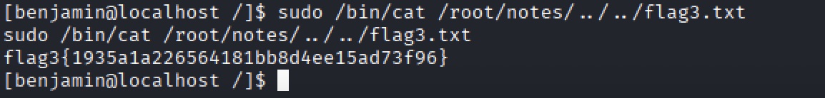 sudo /bin/cat /root/notes/../../flag3.txt返回结果